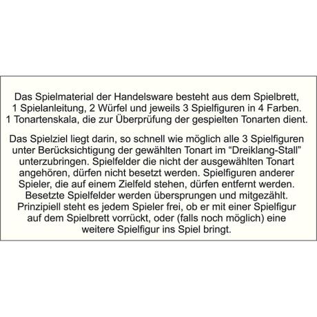 Un jeu de damier pour 2 - 4 joueurs, mais où un faible niveau de la formation musicale préalable est donné. L'objectif est de consolider la connaissance des tonalités apprises d'une manière tout à fait ludique. L'objectif du jeu est de caser chacun des figures le plus rapidement possible dans »l'étable de triade« tenant compte de la tonalité choisise. On a gagné le jeu si on est le premier arrivé avec les 3 figures. Il y a la possibilité de jouer aux modes majeurs, aux modes mineurs harmonieux et aux modes mineurs mélodiques. Le niveau de difficulté est divisé en 6 niveaux.